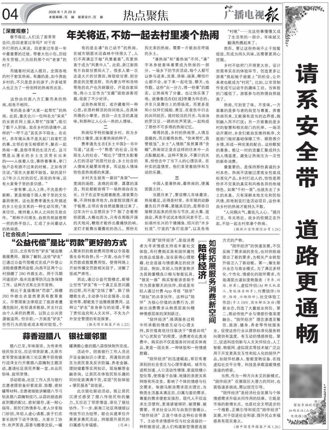 “陪伴经济”是经济社会发展与个体情感需求升级共同作用的结果,它既是市场的新增长点,也是社会文明进步的一个缩影,正确引导和规范“陪伴经济”发展,对于促进社会和谐、提升民众幸福感具有现实意义。(据中国青年报客户端1.26)