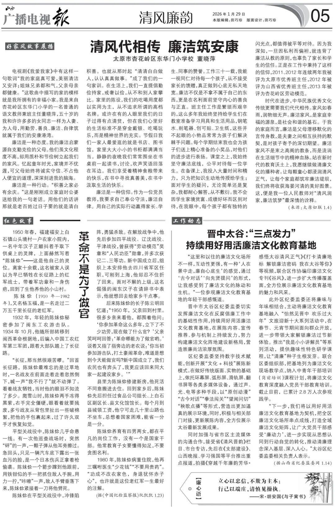 “下一步,我们将以用好用活廉洁文化教育基地为契机,把全区廉洁文化场所串点成线,打造全域廉洁文化矩阵,让广大党员干部感受‘廉动力’,进一步实现从思想认同到行动自觉的转化,推动清廉理念深入基层、深入人心。”太谷区纪委监委相关负责人表示。(据山西省纪委监委网1.14)